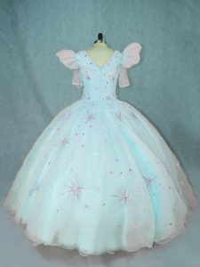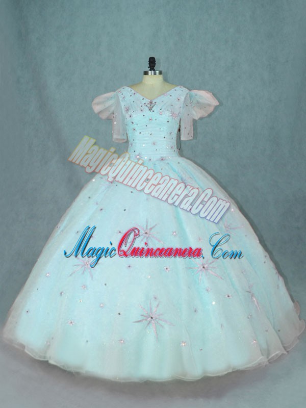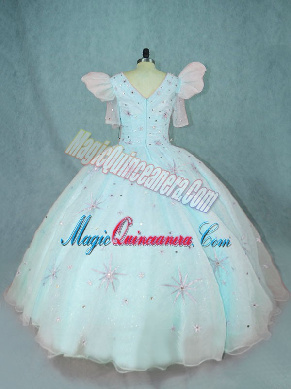 Artistic Apple Green Ball Gowns V-neck Short Sleeves Organza Floor Length Zipper Beading Quinceanera Gown