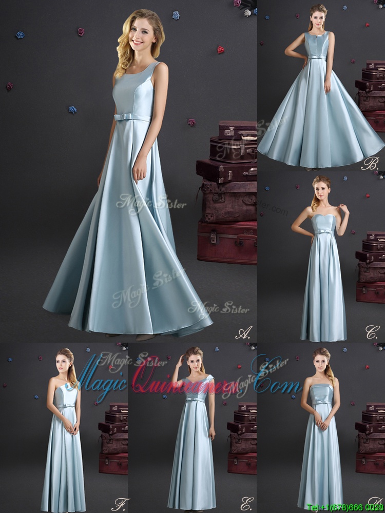 Artistic Floor Length Zipper Dama Dress for Quinceanera Light Blue and In for Prom and Party and Wedding Party with Bowknot