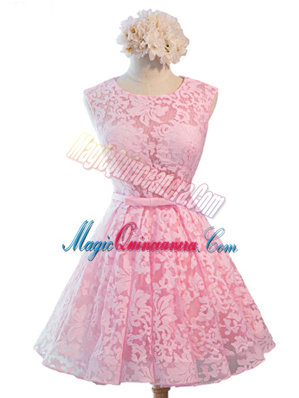 Artistic Knee Length Baby Pink Vestidos de Damas Lace Sleeveless Belt