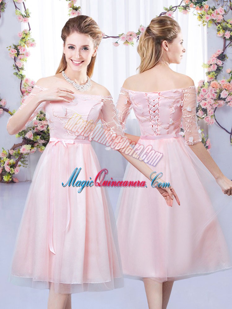 , Artistic Tea Length Empire Half Sleeves Baby Pink Vestidos de Damas Lace Up