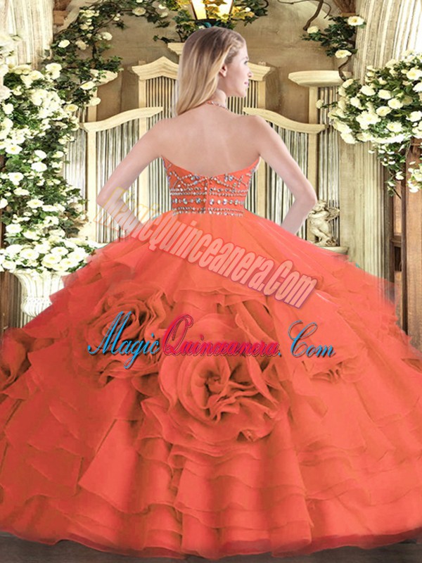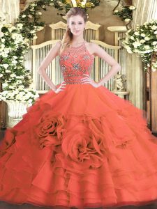 Artistic Tulle Halter Top Sleeveless Zipper Beading and Ruffled Layers Sweet 16 Dress in Red