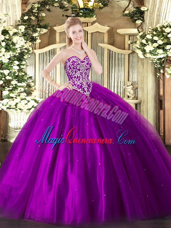 Attractive Eggplant Purple Ball Gowns Tulle Sweetheart Sleeveless Beading Floor Length Lace Up Quinceanera Dresses