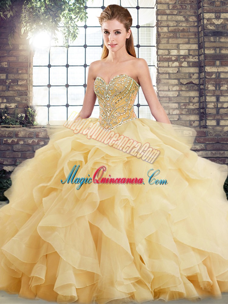 Attractive Gold Vestidos de Quinceanera Military Ball and Sweet 16 and Quinceanera with Beading and Ruffles Sweetheart Sleeveless Brush Train Lace Up