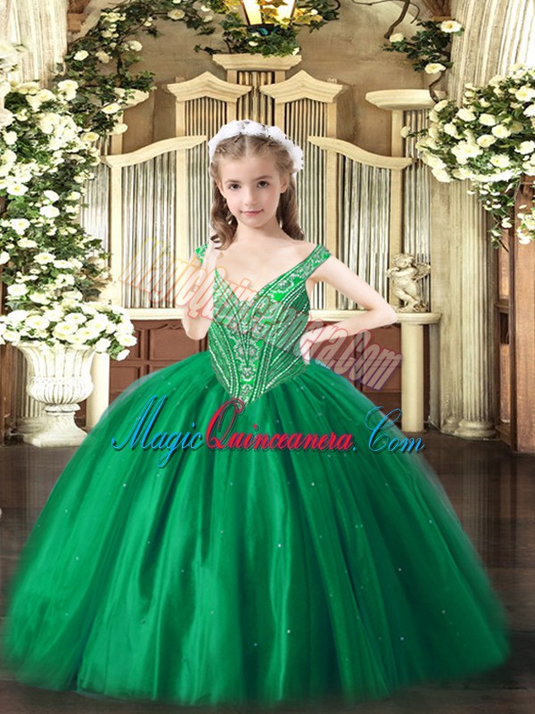 Attractive Green Ball Gowns Beading Pageant Dress for Womens Lace Up Tulle Sleeveless Floor Length
