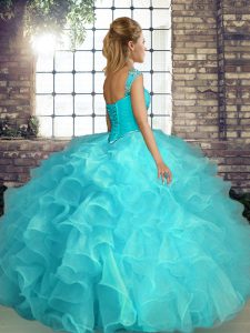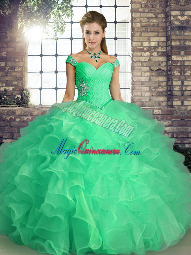 Attractive Off The Shoulder Sleeveless 15th Birthday Dress Floor Length Beading and Ruffles Turquoise Organza