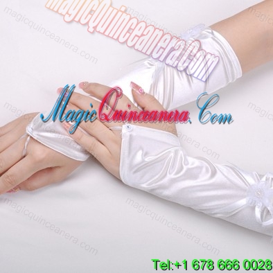 , Attractive Satin Fingerless Elbow Length Bridal Gloves With Hand Made Flower