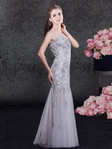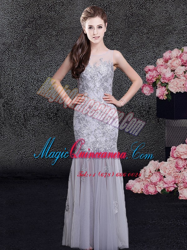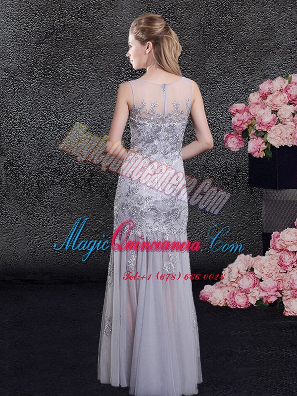 Attractive Scoop Sleeveless Floor Length Lace and Appliques Zipper Mother Of The Bride Dress with Grey