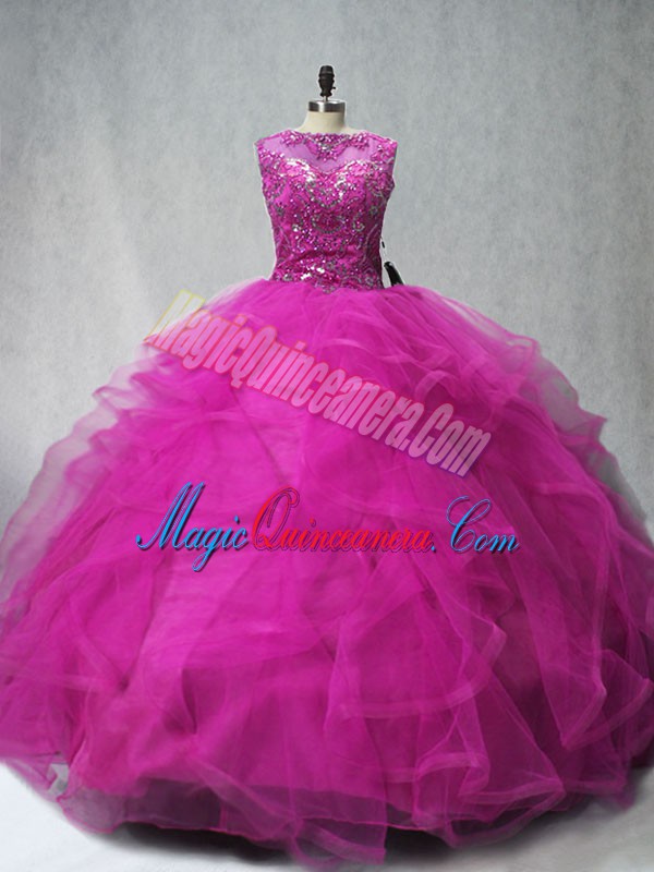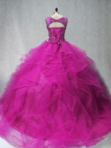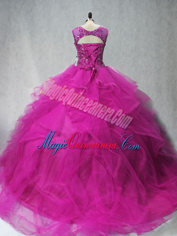 Attractive Scoop Sleeveless Tulle 15 Quinceanera Dress Beading and Ruffles Brush Train Lace Up