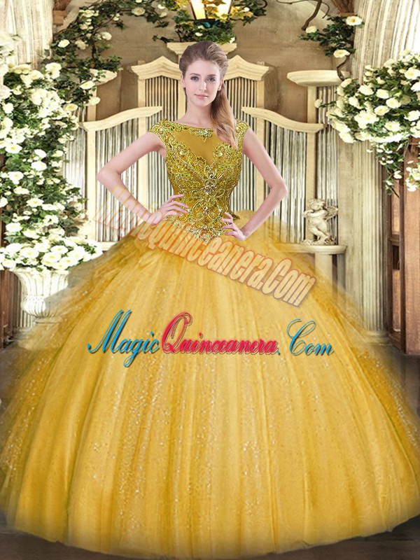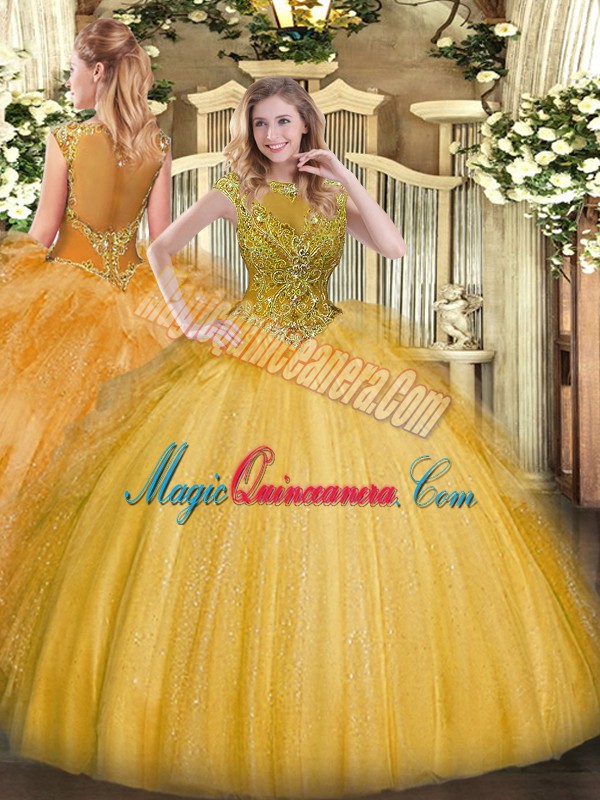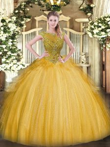 , Attractive Scoop Sleeveless Zipper Ball Gown Prom Dress Gold Tulle