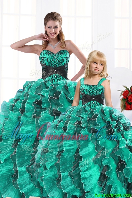Attractive Turquoise Ball Gowns Organza Sweetheart Sleeveless Beading and Appliques and Ruffles Floor Length Lace Up Quince Ball Gowns