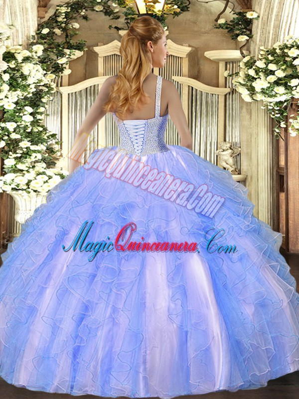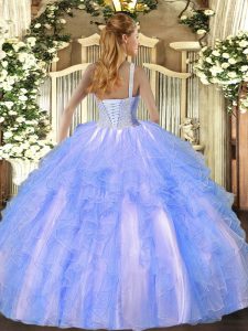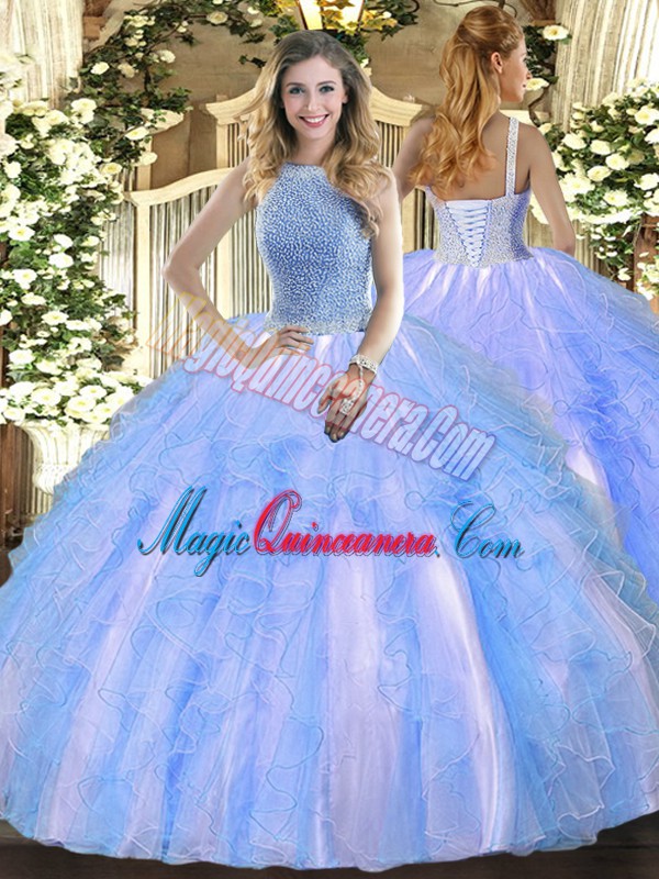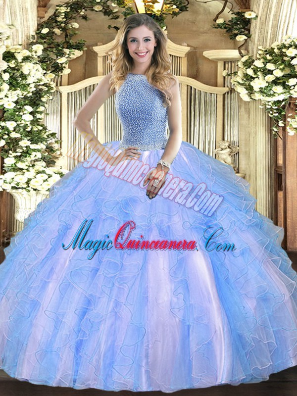 Baby Blue 15th Birthday Dress Military Ball and Sweet 16 and Quinceanera with Beading and Ruffles High-neck Sleeveless Lace Up