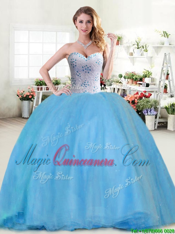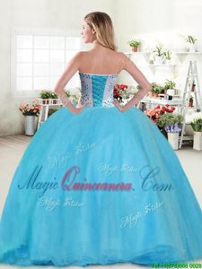 Baby Blue Ball Gowns Tulle Sweetheart Sleeveless Beading Floor Length Lace Up Ball Gown Prom Dress