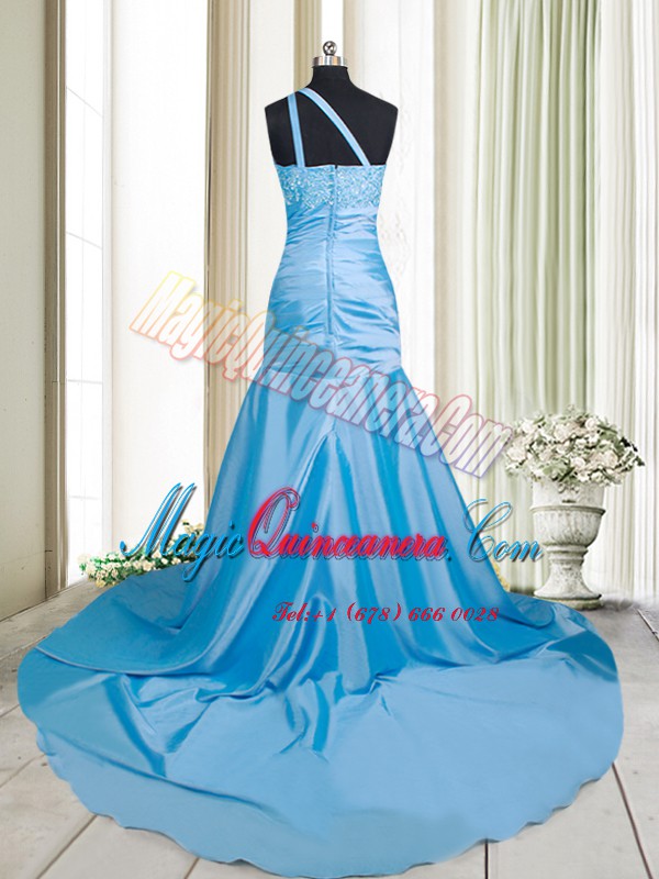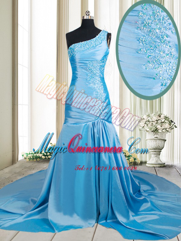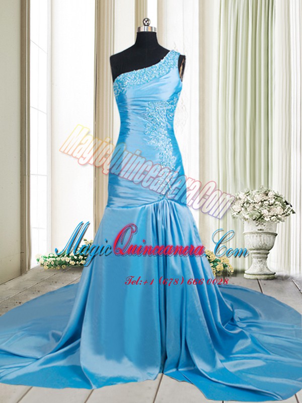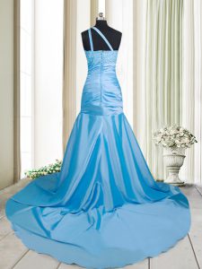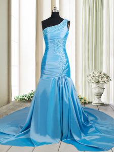 Baby Blue Mermaid One Shoulder Sleeveless Elastic Woven Satin Brush Train Zipper Beading and Appliques