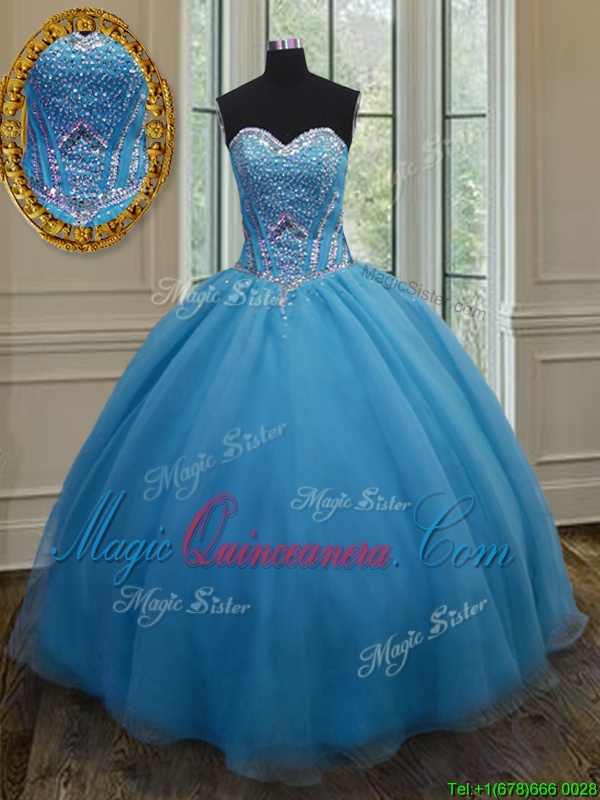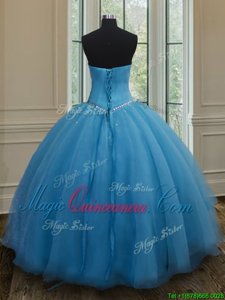 Baby Blue Organza Lace Up Sweetheart Sleeveless Floor Length Quinceanera Dress Beading and Belt