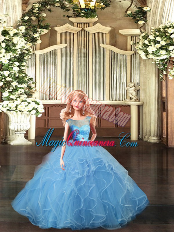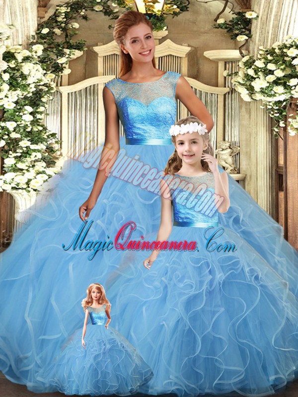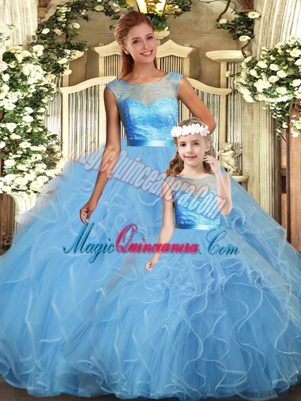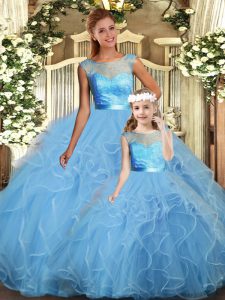 Baby Blue Scoop Backless Lace and Ruffles Quince Ball Gowns Sleeveless
