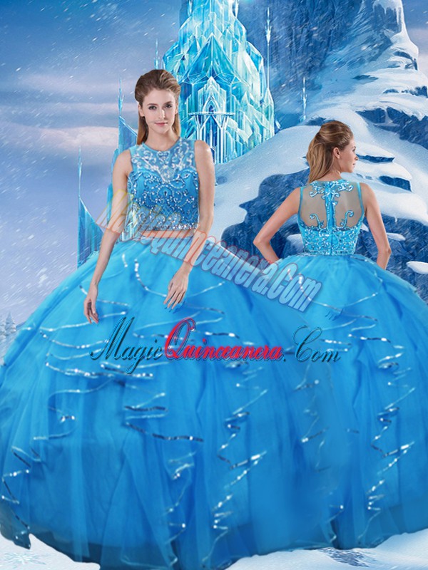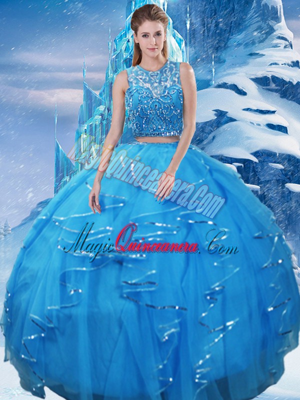 , Baby Blue Scoop Neckline Beading and Ruffles Ball Gown Prom Dress Sleeveless Zipper