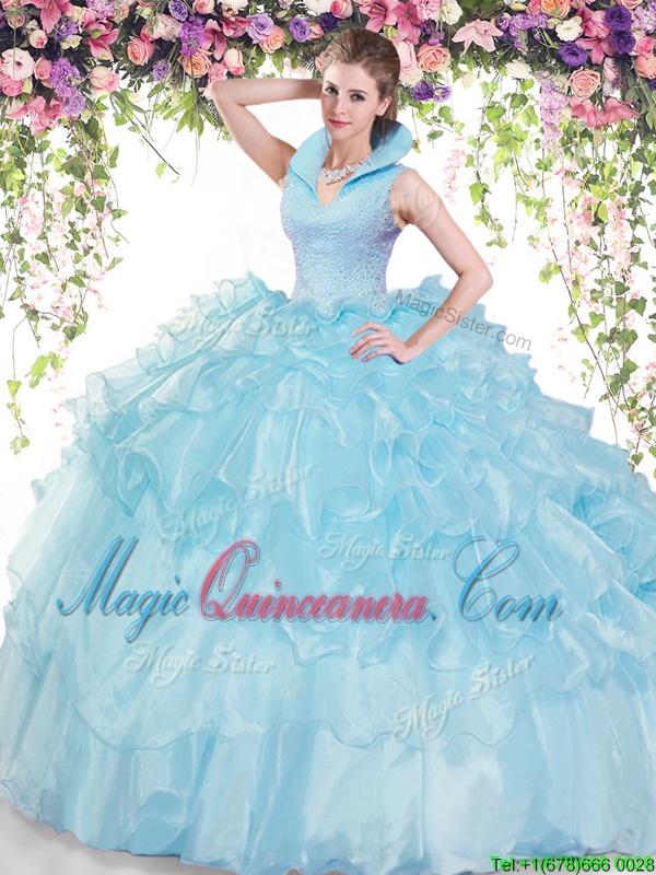 Baby Blue Sleeveless Floor Length Beading and Ruffled Layers Backless Sweet 16 Quinceanera Dress