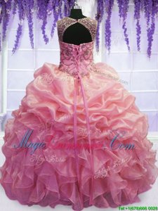 Baby Pink Ball Gowns Scoop Sleeveless Organza Floor Length Lace Up Beading and Pick Ups Sweet 16 Quinceanera Dress
