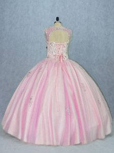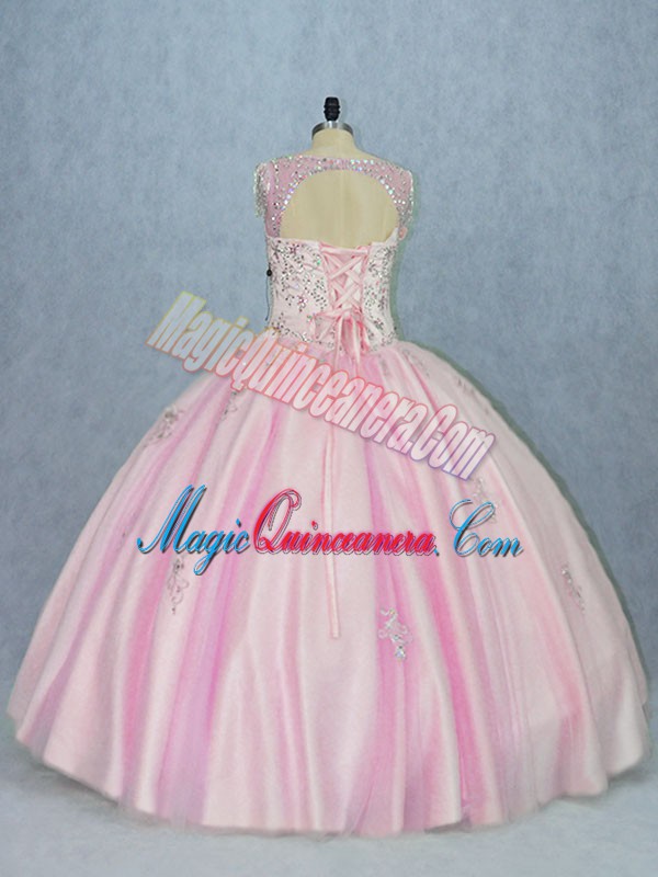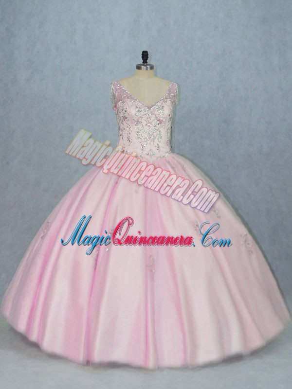 Baby Pink Ball Gowns V-neck Sleeveless Tulle Floor Length Backless Beading and Appliques Quince Ball Gowns