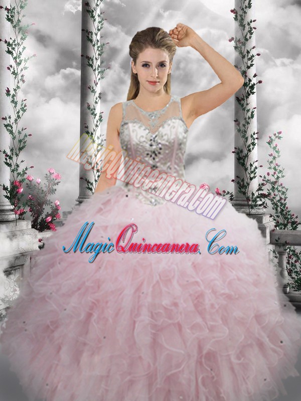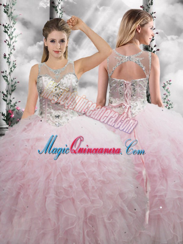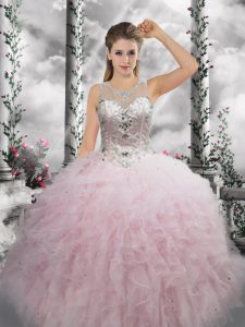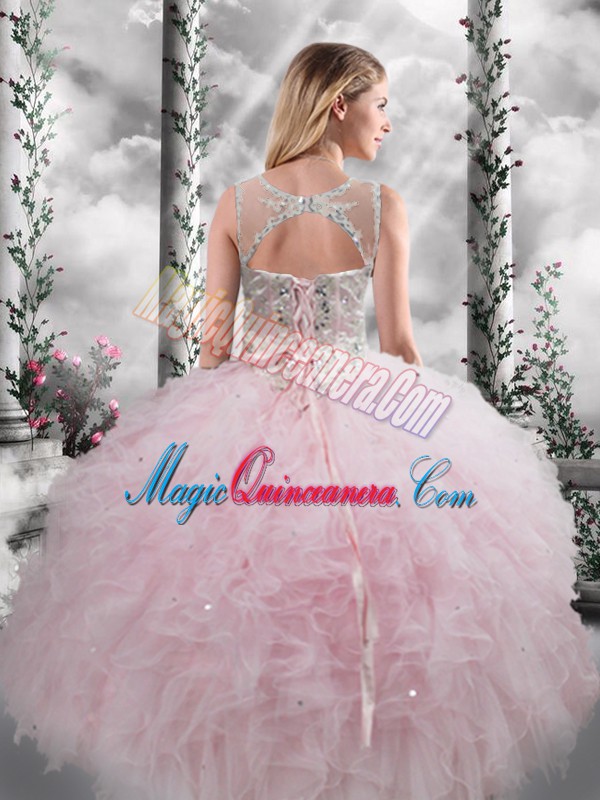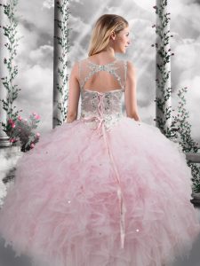 Baby Pink Vestidos de Quinceanera Military Ball and Sweet 16 and Quinceanera with Beading and Ruffles Scoop Sleeveless Lace Up