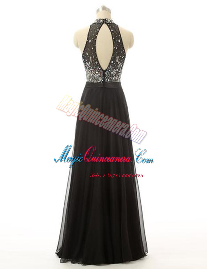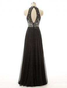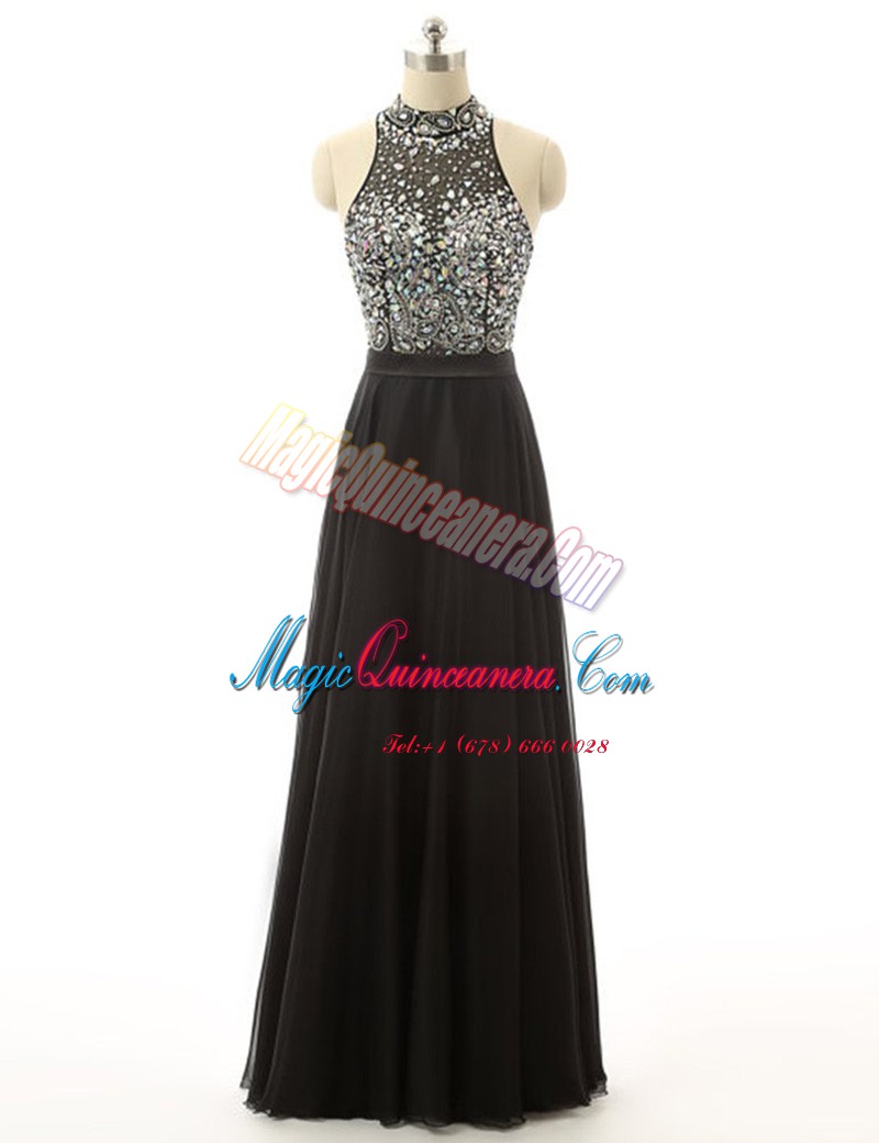 , Backless Floor Length Black Prom Evening Gown Tulle Sleeveless Beading