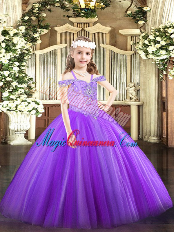Ball Gowns Little Girls Pageant Dress Wholesale Lavender Off The Shoulder Tulle Sleeveless Floor Length Lace Up