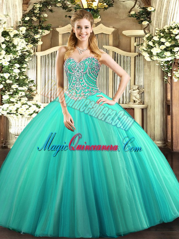 Ball Gowns Quince Ball Gowns Aqua Blue Sweetheart Tulle Sleeveless Floor Length Lace Up