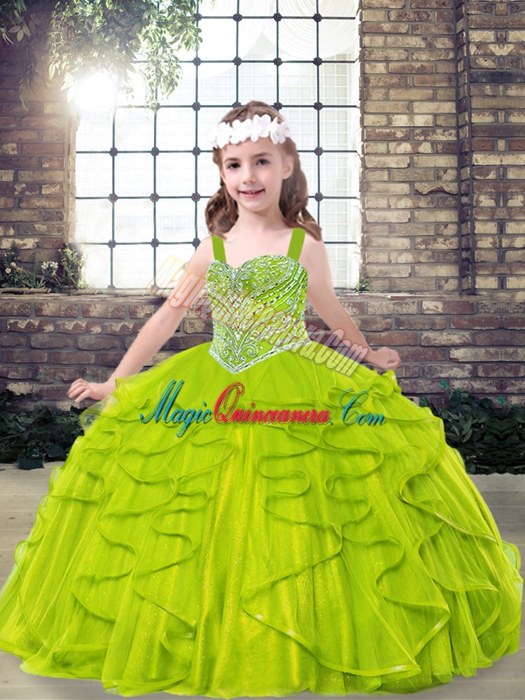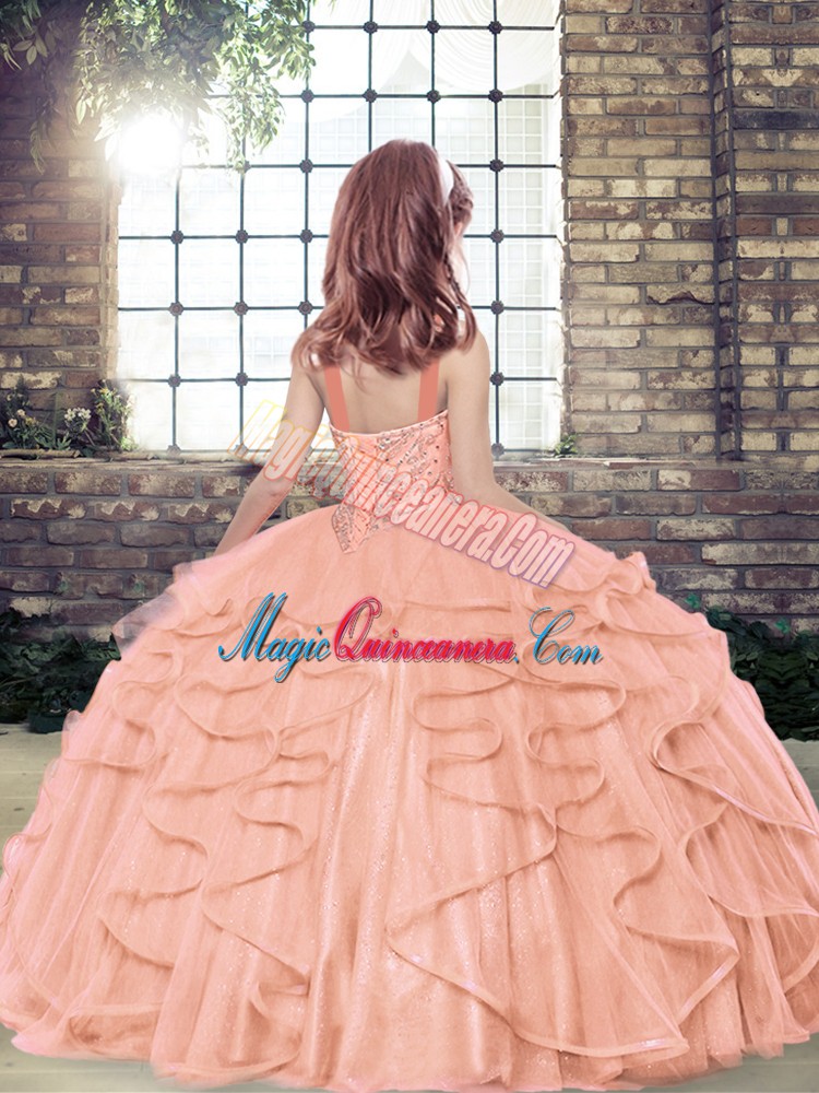 Ball Gowns Tulle Straps Sleeveless Beading and Ruffles Floor Length Lace Up Kids Pageant Dress