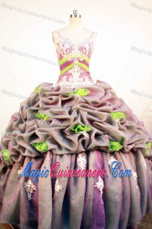 spaghetti straps real sample quinceanera dress with pick ups and flowers,