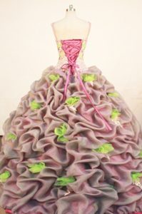 appliqued quinceanera dress with pick ups and flowers,