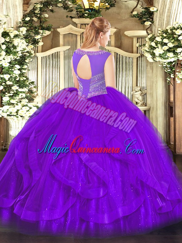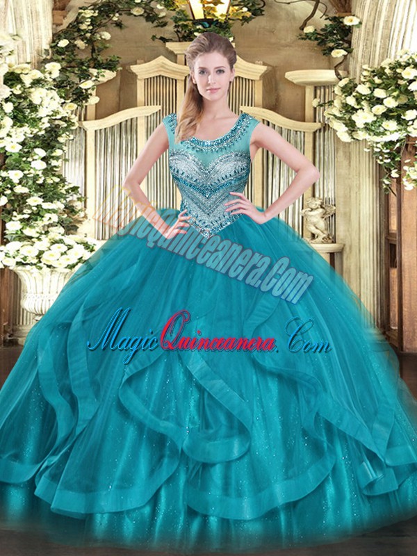, Beading and Ruffles Quinceanera Gown Teal Lace Up Sleeveless Floor Length