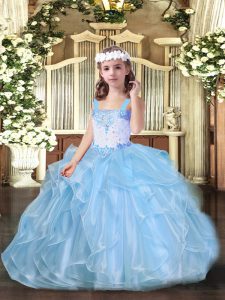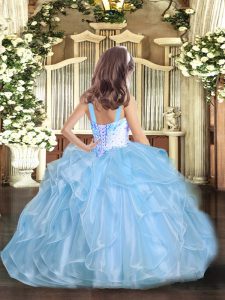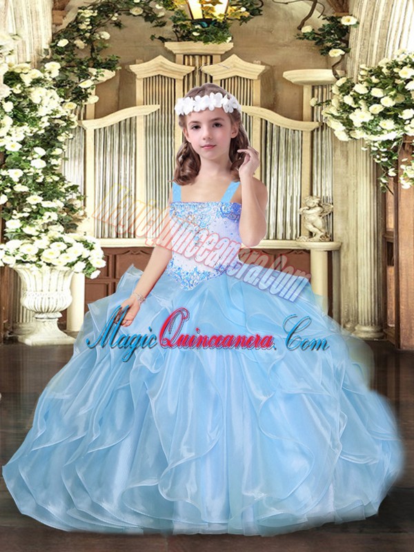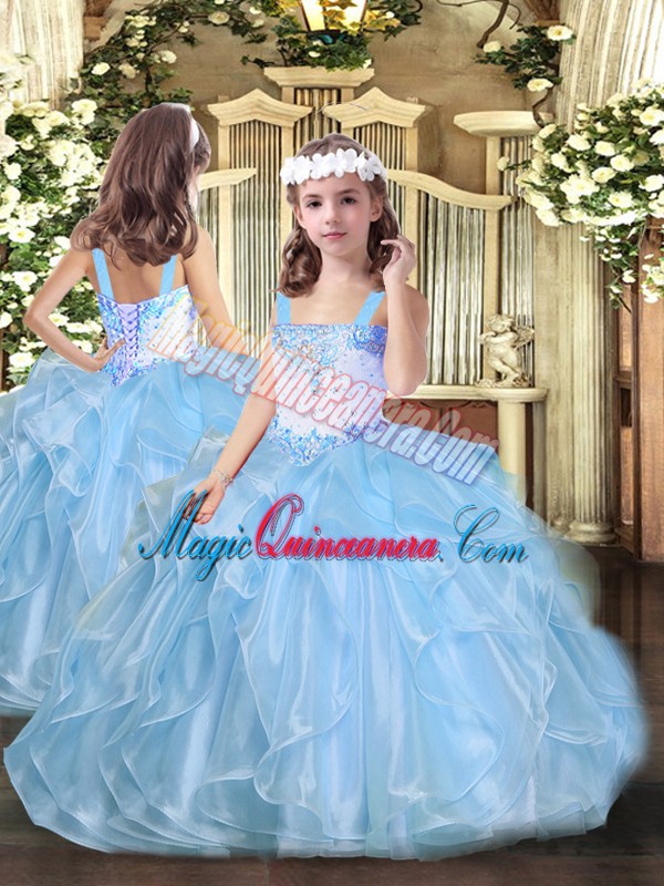 Beauteous Baby Blue Little Girl Pageant Gowns Party and Sweet 16 and Wedding Party with Beading and Ruffles Straps Sleeveless Lace Up