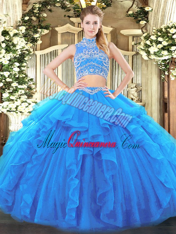 Beauteous Baby Blue Two Pieces Tulle High-neck Sleeveless Beading and Ruffles Floor Length Backless 15th Birthday Dress