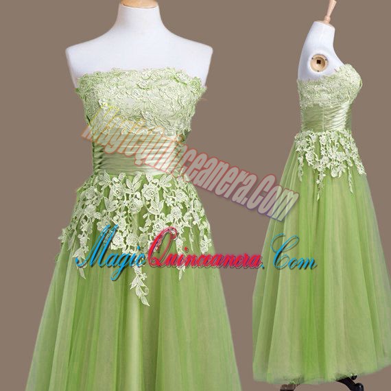 Beauteous Empire Tulle Strapless Sleeveless Appliques Tea Length Lace Up Vestidos de Damas