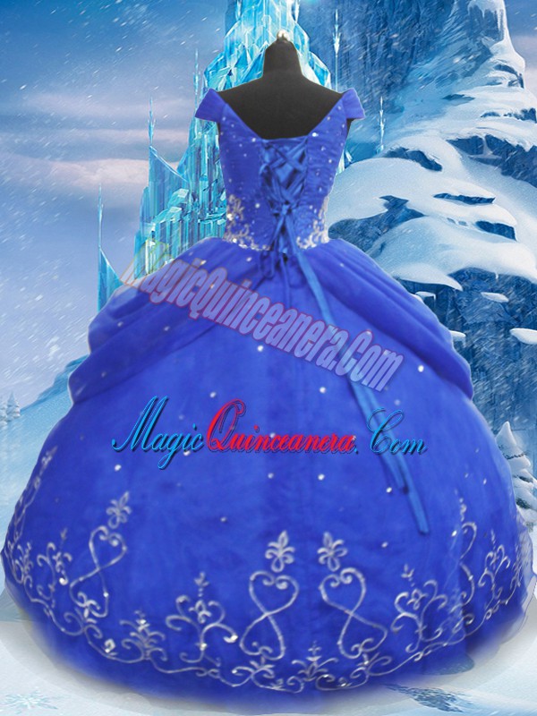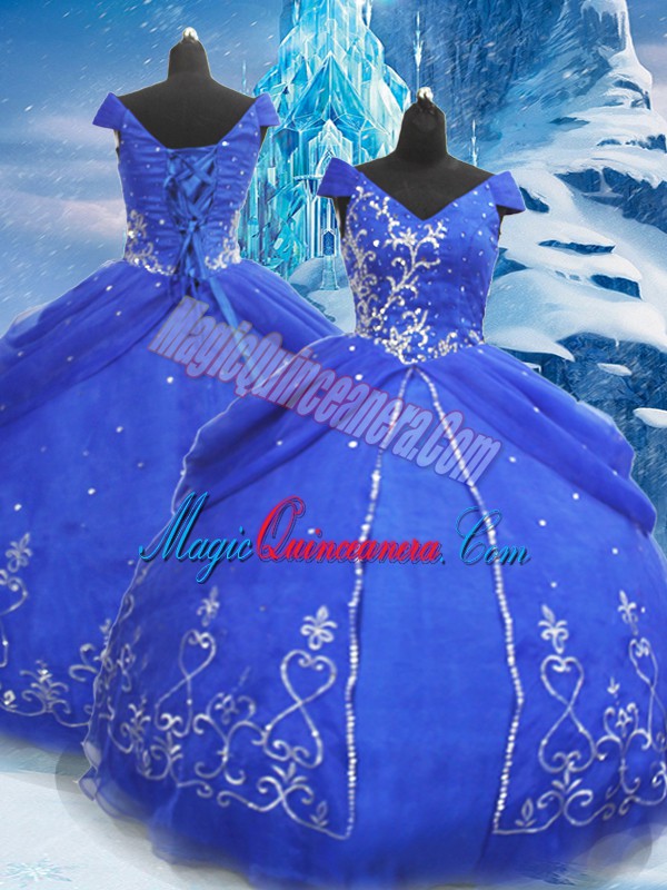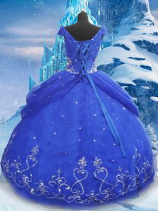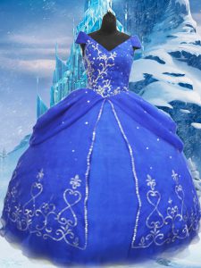 Beauteous Floor Length Blue Sweet 16 Dresses V-neck Short Sleeves Lace Up