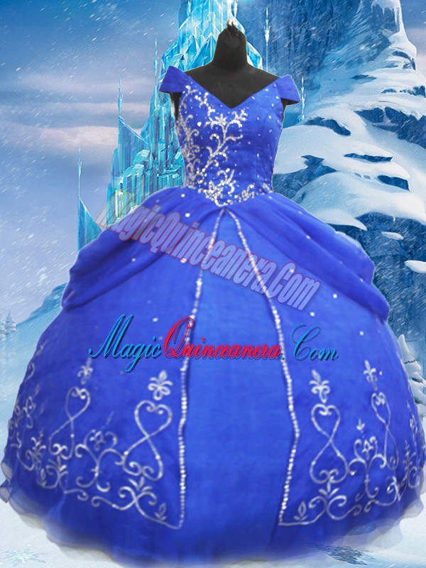 , Beauteous Floor Length Blue Sweet 16 Dresses V-neck Short Sleeves Lace Up