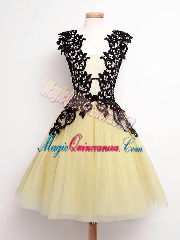 Beauteous Gold A-line Tulle Straps Sleeveless Lace Knee Length Lace Up Damas Dress