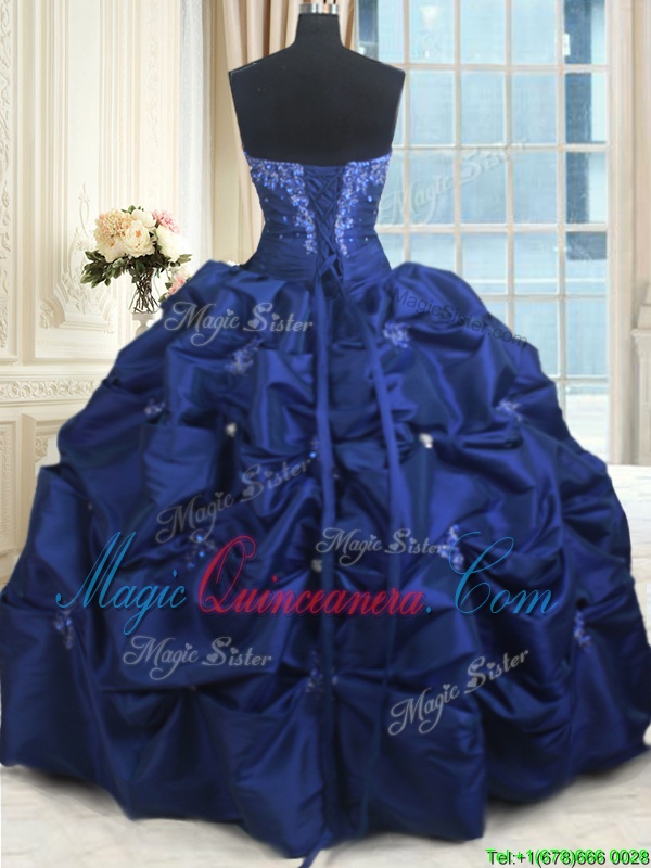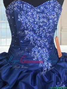 Beauteous Navy Blue Taffeta Lace Up Sweetheart Sleeveless Floor Length Quince Ball Gowns Appliques and Pick Ups
