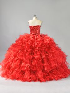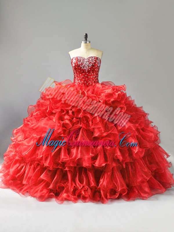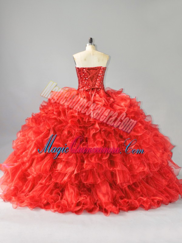Beauteous Red Ball Gowns Organza Sweetheart Sleeveless Beading and Ruffles and Sequins Floor Length Lace Up 15th Birthday Dress