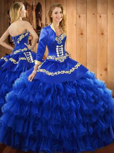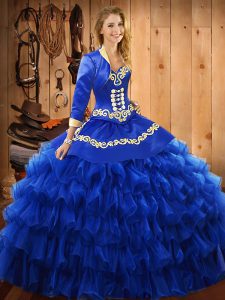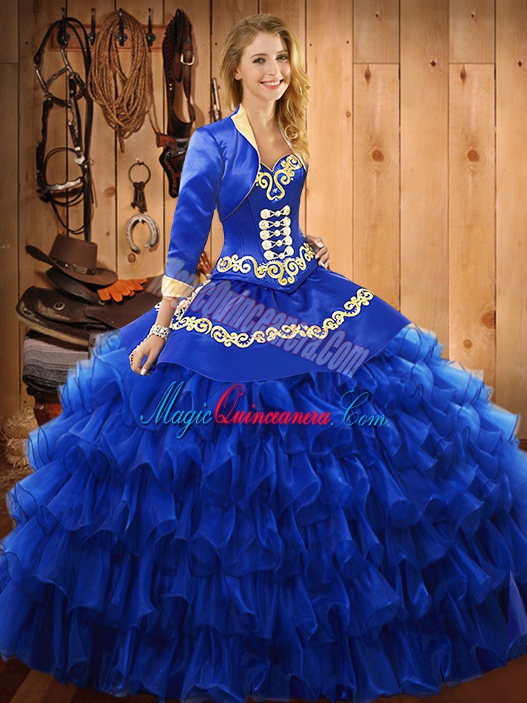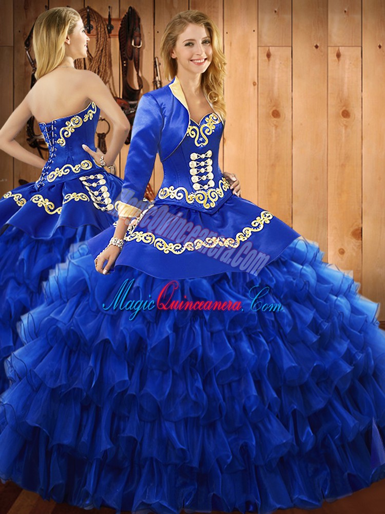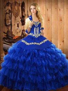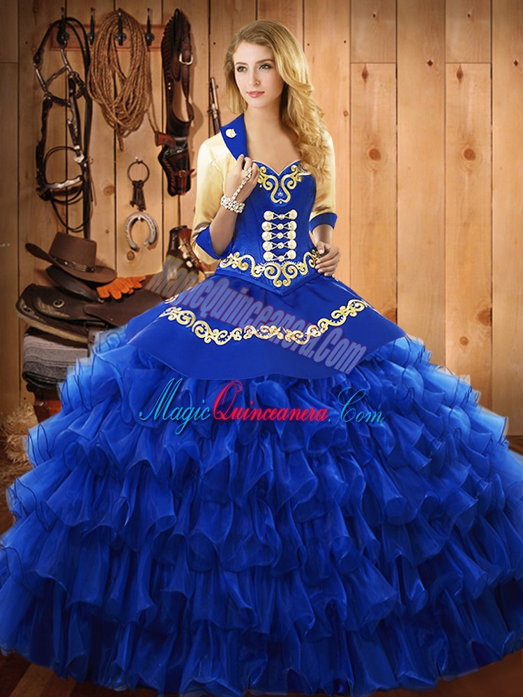 Beauteous Sweetheart Sleeveless Sweet 16 Dresses Floor Length Embroidery and Ruffled Layers Blue Satin and Organza
