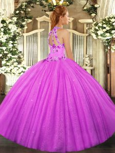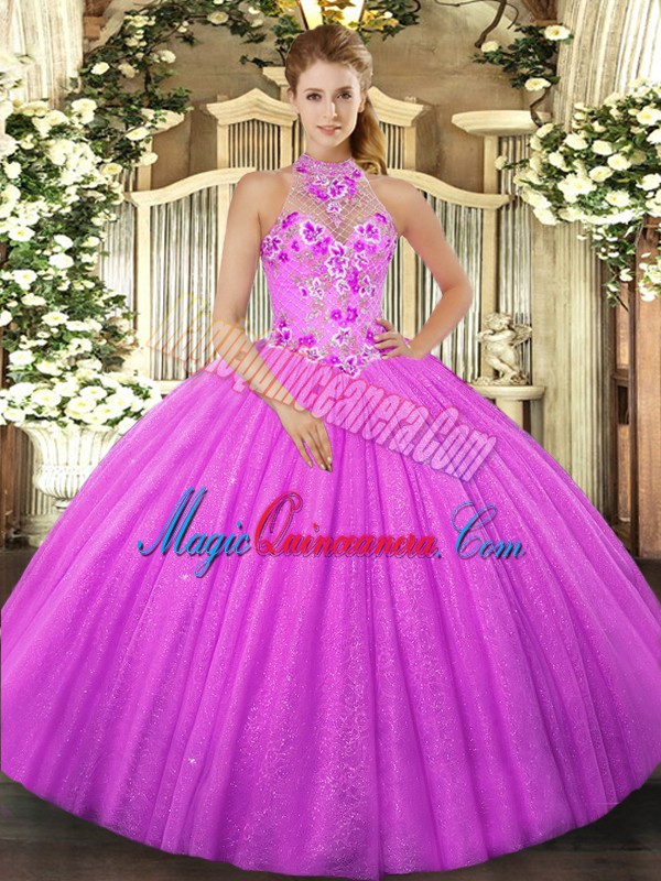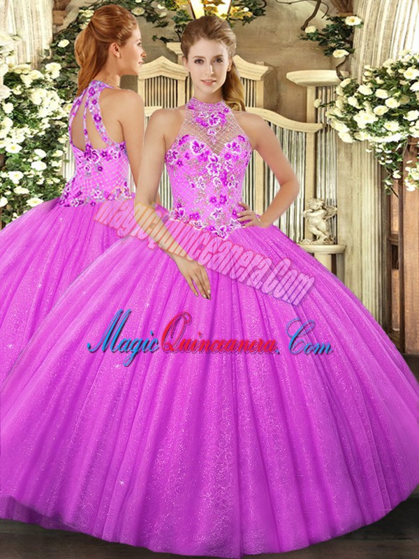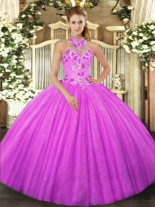 Beauteous Tulle Halter Top Sleeveless Lace Up Beading and Embroidery Quinceanera Gowns in Fuchsia