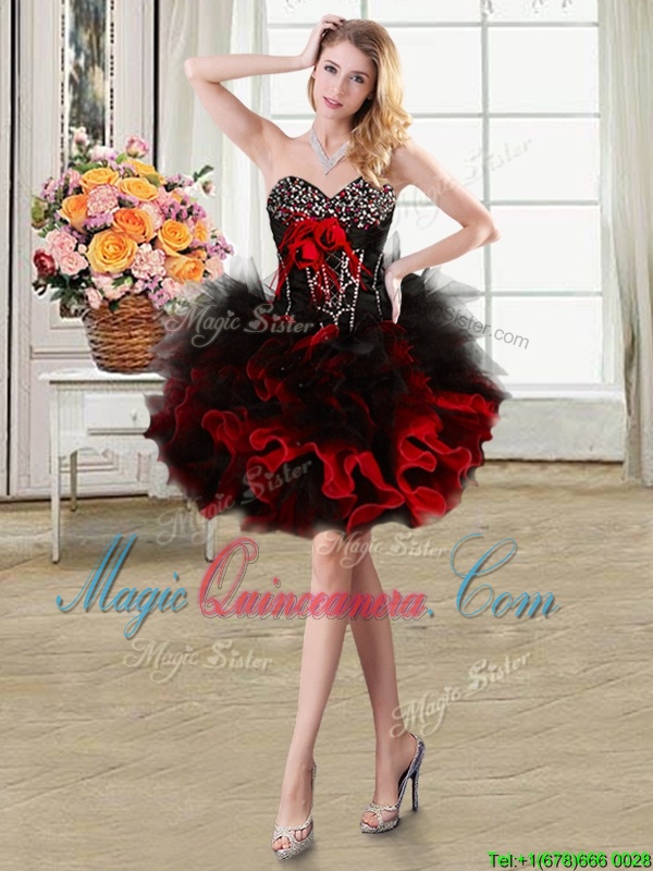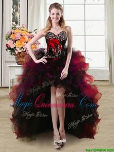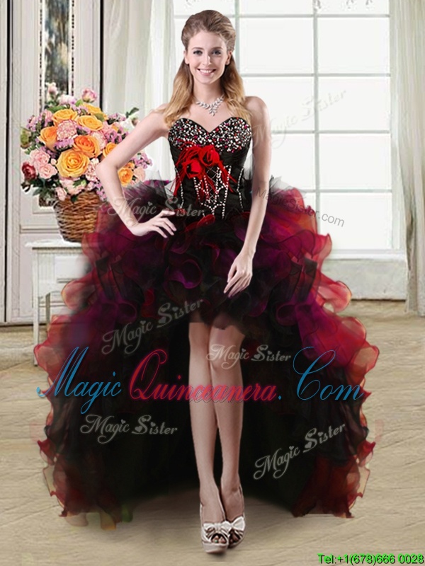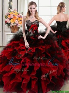 Beautiful Four Piece Black and Red Lace Up Sweet 16 Dresses Beading and Ruffles and Hand Made Flower Sleeveless Floor Length
