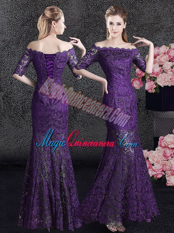 Beautiful Mermaid Off the Shoulder Eggplant Purple Half Sleeves Lace Lace Up Mother Of The Bride Dress for Prom and Party