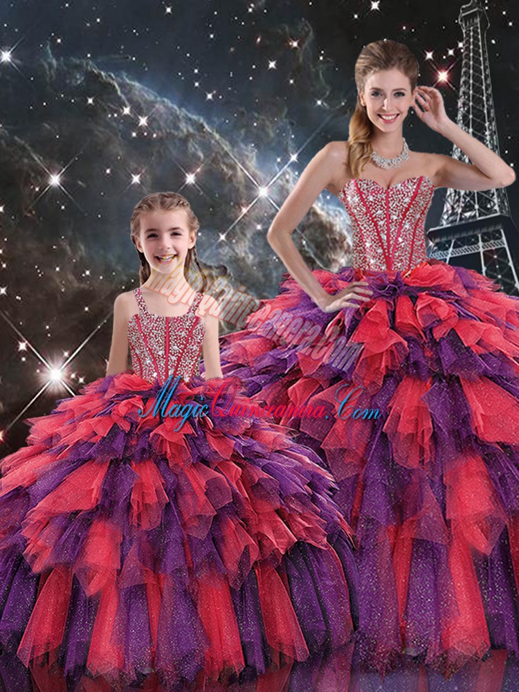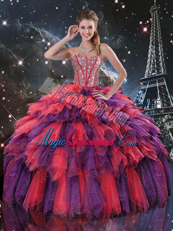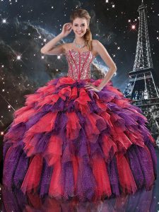 Beautiful Multi-color Organza Lace Up Sweet 16 Dress Sleeveless Floor Length Beading and Ruffles and Ruffled Layers