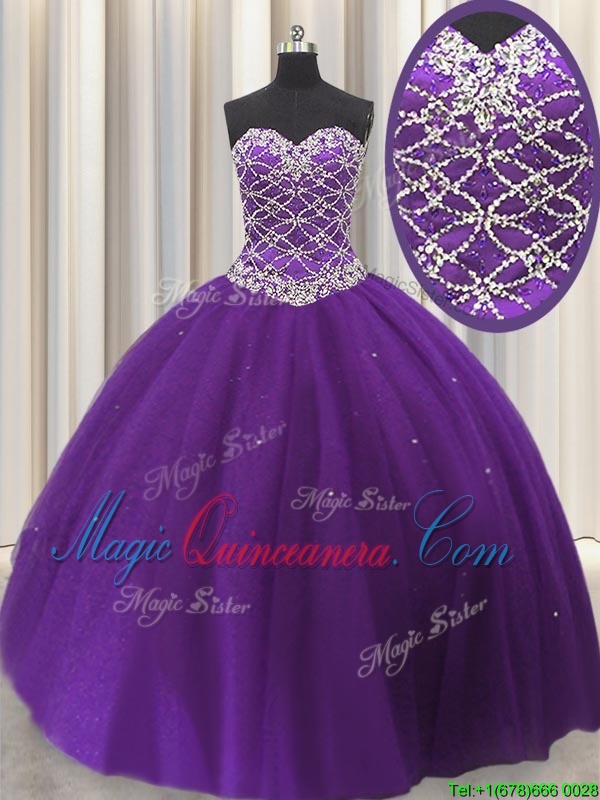 Best Floor Length Eggplant Purple Sweet 16 Dress Tulle Sleeveless Beading and Sequins