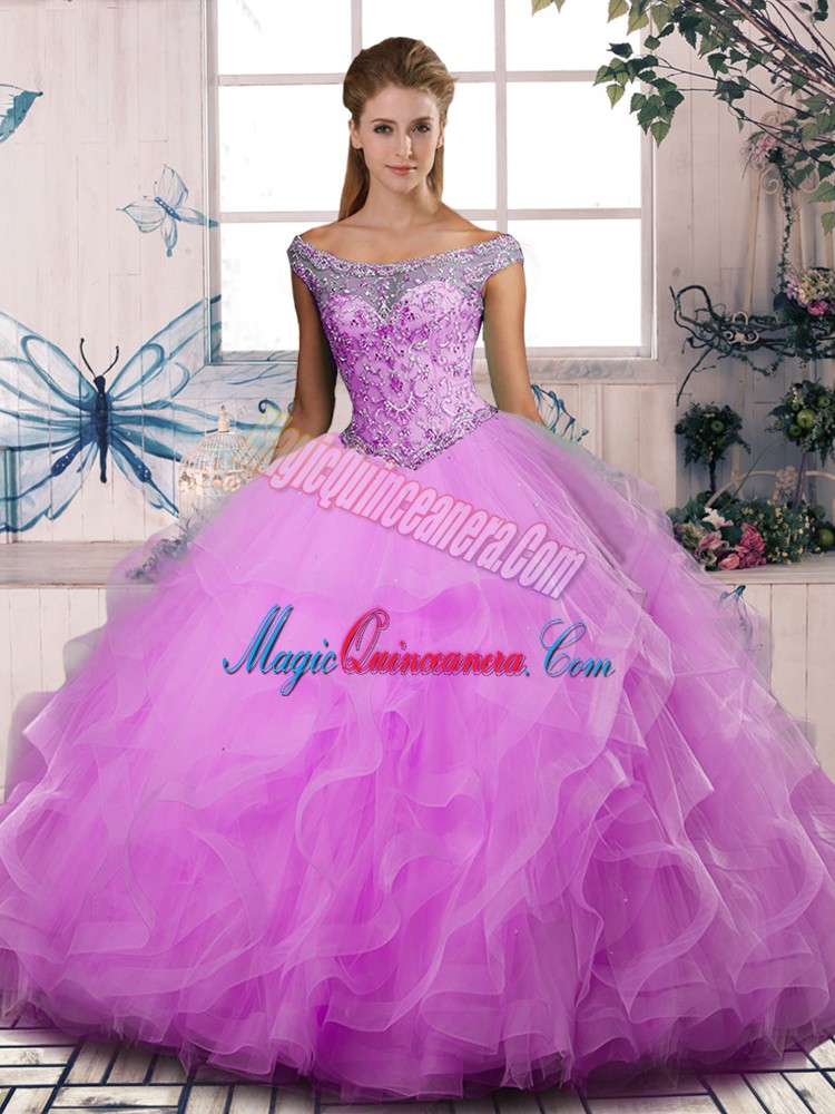 , Best Lilac Lace Up Quinceanera Dresses Beading and Ruffles Sleeveless Floor Length