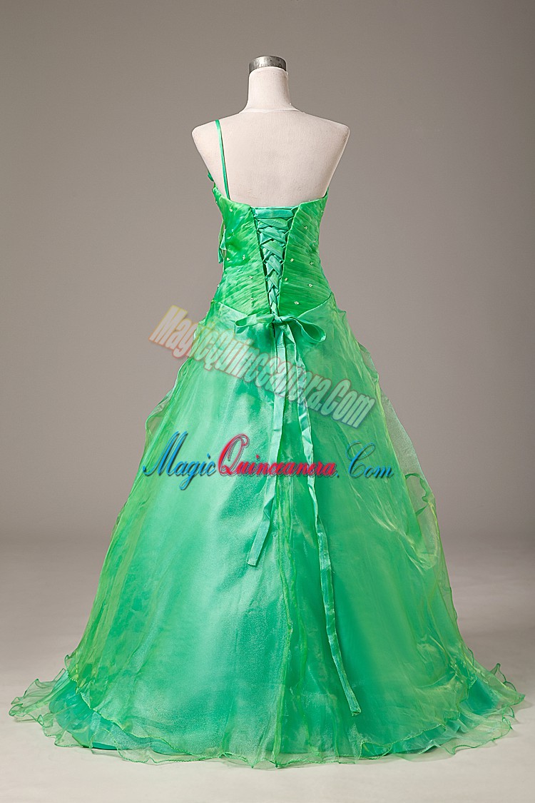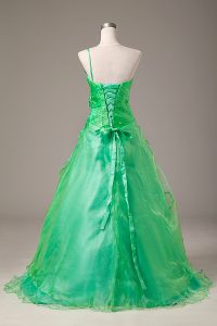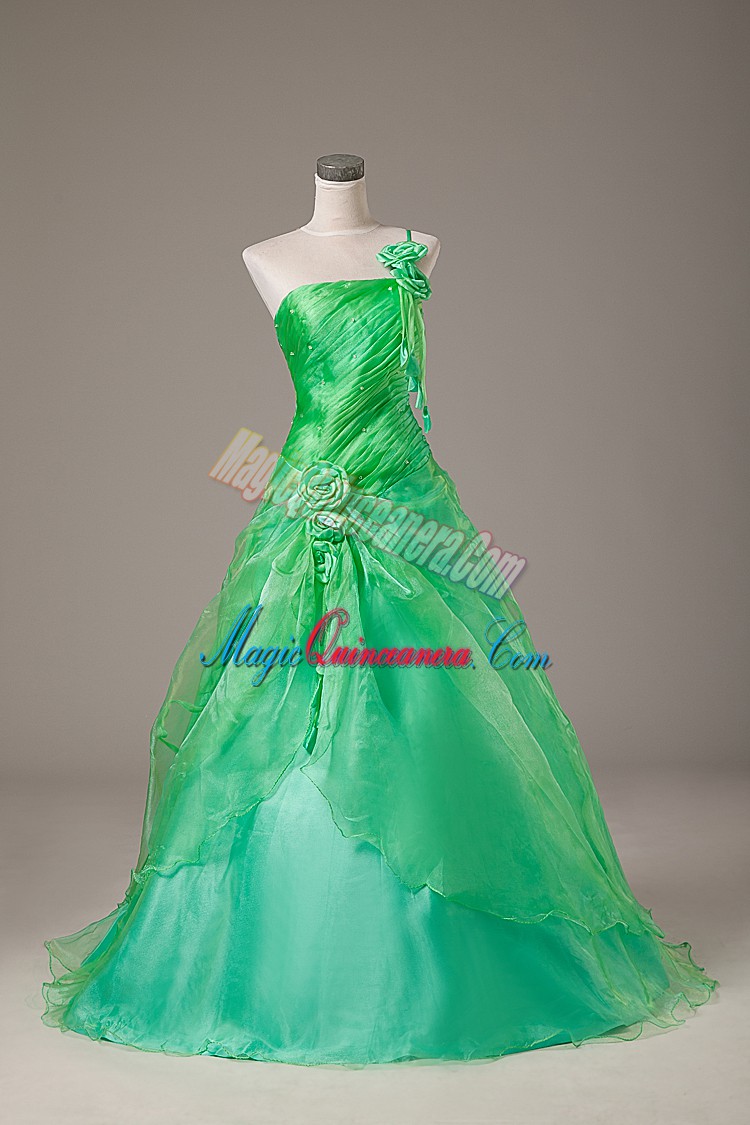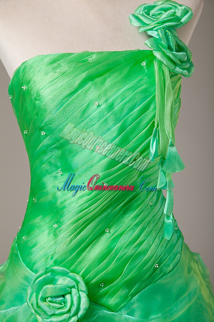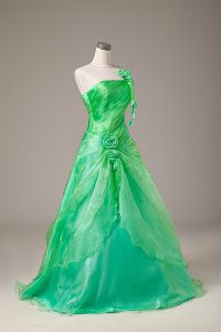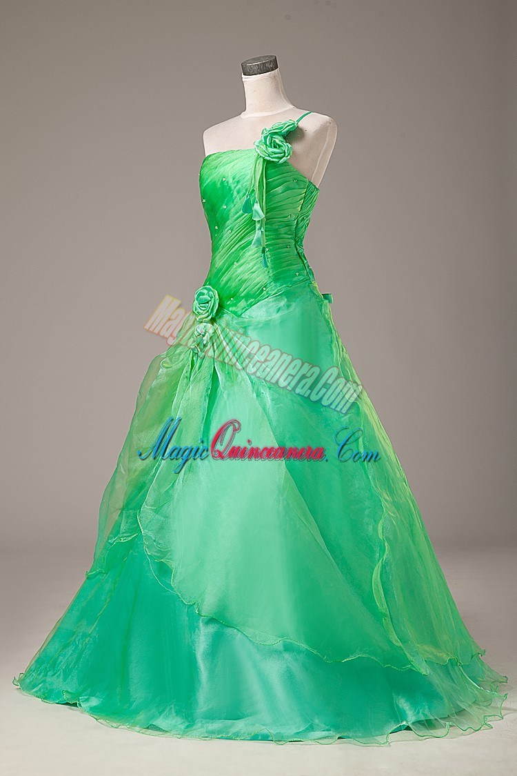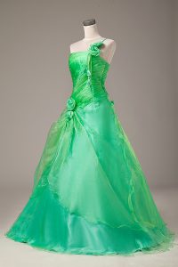 Best One Shoulder Sleeveless Quinceanera Dress Floor Length Hand Made Flower Green Organza