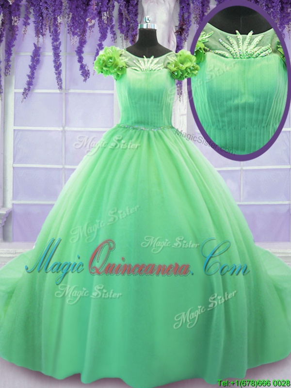 Best Scoop Green Ball Gowns Hand Made Flower Quinceanera Dress Lace Up Tulle Short Sleeves - Magic Quinceanera