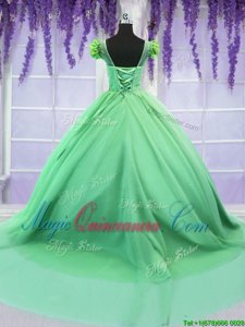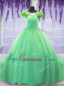 Best Scoop Green Ball Gowns Hand Made Flower Quinceanera Dress Lace Up Tulle Short Sleeves