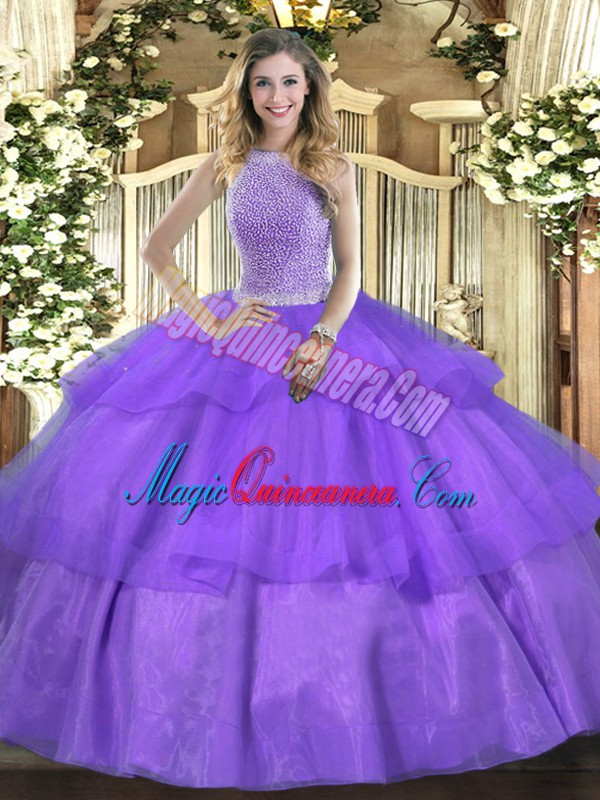 Best Selling Lavender Ball Gowns High-neck Sleeveless Tulle Floor Length Lace Up Beading and Ruffled Layers Quince Ball Gowns